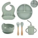 ست ظرف غذای سیلیکونی کودک 7 تکه شامل یک بشقاب سه تکه با خاصیت ضد لغزش، یک بشقاب لبه دار با قطر حدود 16 سانتیمتر و ضد لغزش، کاسه ماست یا سوپ خوری با قطر 11.5 و ارتفاع حدود 5 سانتی متر و حجم 330 میل و خاصیت ضد لغزش، یک لیوان دسته و نی دار ۱۵۰ میل و یک جفت قاشق و چنگال نرم و سیلیکونی میباشد.