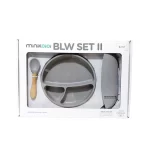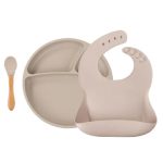 ست غذاخوری 3 تکه سیلیکونی مینیک اوی اوی MinikOiOi شامل : بشقاب تقسیم بندی شده سیلیکونی – قاشق سیلیکونی دسته چوبی – پیشبند سیلیکونی است.