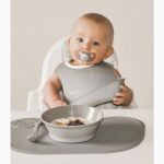 جنس های سیلیکونی برای پیشبند بسیار مناسب هستند چرا که این نوع جنس ها رطوبت را از خود عبور نمی دهند و از نفوذ نم و رطوبت غذا و چربی به لباس کودک به طور کامل جلوگیری می کند.